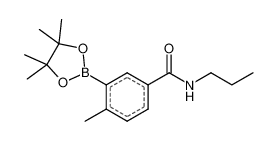 Product Name: 4-methyl-N-propyl-3-(4,4,5,5-tetramethyl-1,3,2-dioxaborolan-2-yl)benzamide Order number: 210518 CAS: 911490-25-0 Purity: 95% Appearance: n.a. MF: C17H26BNO3 MW: 303.204 MP: n.a. oC Description: Boronic acids are widely used in organic chemistry, pharmaceuticals, materials science, and sensor technology. |