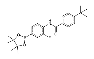 Product Name: 4-tert-butyl-N-(2-fluoro-4-(4,4,5,5-tetramethyl-1,3,2-dioxaborolan-2-yl)phenyl)benzamide Order number: 210571 CAS: 2235408-81-6 Purity: 95% Appearance: n.a. MF: C23H29BFNO3 MW: 397.291 MP: n.a. oC Description: Boronic acids are widely used in organic chemistry, pharmaceuticals, materials science, and sensor technology. |