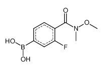 Product Name: 3-FLUORO-4-[(N-METHOXY-N-METHYL)CARBAMOYL]BENZENEBORONIC ACID 98 Order number: 208997 CAS: 913835-59-3 Purity: 98% Appearance: n.a. MF: C9H11BFNO4 MW: 226.997 MP: n.a. oC Description: Boronic acids are widely used in organic chemistry, pharmaceuticals, materials science, and sensor technology. |