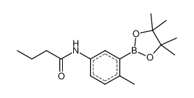 Product Name: N-[4-methyl-3-(tetramethyl-1,3,2-dioxaborolan-2-yl)phenyl]butanamide Order number: 209741 CAS: 2246814-38-8 Purity: 95% Appearance: n.a. MF: C17H26BNO3 MW: 303.204 MP: n.a. oC Description: Boronic acids are widely used in organic chemistry, pharmaceuticals, materials science, and sensor technology. |