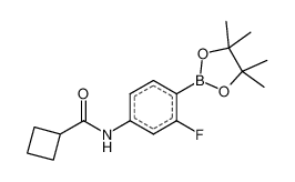 Product Name: N-[3-fluoro-4-(tetramethyl-1,3,2-dioxaborolan-2-yl)phenyl]cyclobutanecarboxamide Order number: 209806 CAS: 2246801-72-7 Purity: 95% Appearance: n.a. MF: C17H23BFNO3 MW: 319.179 MP: n.a. oC Description: Boronic acids are widely used in organic chemistry, pharmaceuticals, materials science, and sensor technology. |
