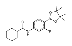 Product Name: Cyclohexanecarboxamide, N-[3-fluoro-4-(4,4,5,5-tetramethyl-1,3,2-dioxaborolan-2-yl)phenyl]- Order number: 210280 CAS: 2246657-45-2 Purity: 95% Appearance: n.a. MF: C19H27BFNO3 MW: 347.232 MP: n.a. oC Description: Boronic acids are widely used in organic chemistry, pharmaceuticals, materials science, and sensor technology. |