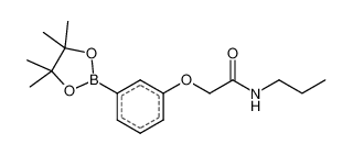 Product Name: N-propyl-2-(3-(4,4,5,5-tetramethyl-1,3,2-dioxaborolan-2-yl)phenoxy)acetamide Order number: 210353 CAS: 2057448-33-4 Purity: 95% Appearance: n.a. MF: C17H26BNO4 MW: 319.204 MP: n.a. oC Description: Boronic acids are widely used in organic chemistry, pharmaceuticals, materials science, and sensor technology. |